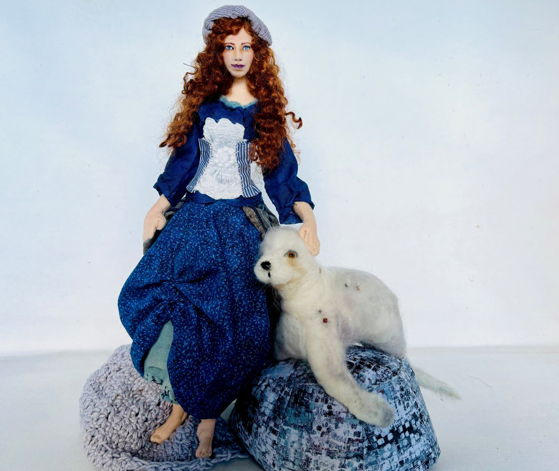 Cloth art doll - Selkie art doll. Needle felted seal companion. Unique gift for art doll and fairytale lovers. This art doll is is made of tricot fabric over a wire frame armature . The seal is made with merino wool felted over a wire armature and has glass bead eyes and sculpted face.